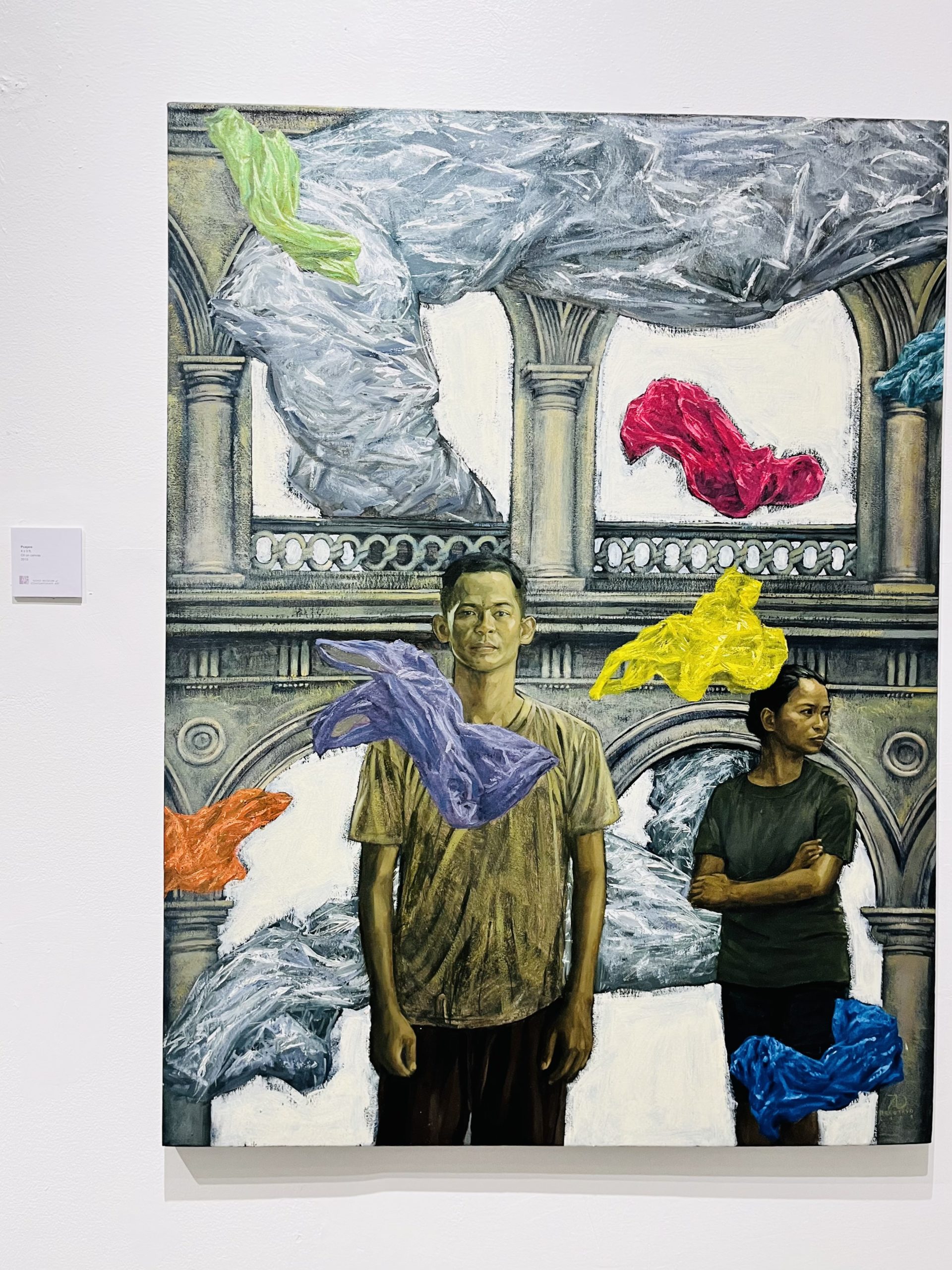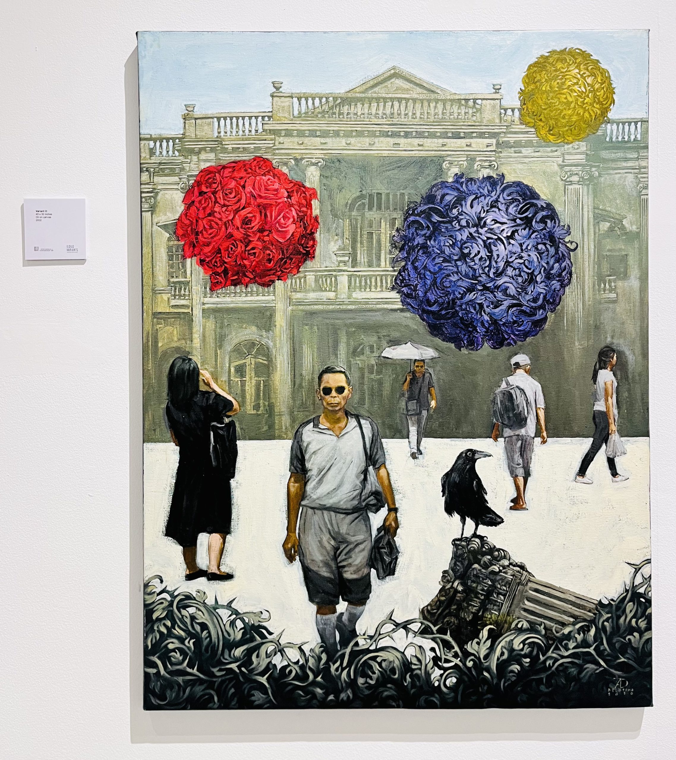 The collection exposes the historical ills and the ongoing exploitation of the capitalist system, which was highlighted by the COVID-19 pandemic and succinctly represented by the work Domination (Oil on Canvas), which showed the Lizares Mansion gates with an ironwork arch above them “harking to the stockade entrance of the Holocaust Auschwitz Camp, with an English translation of the sardonic phrase Arbeit Macht Frei (Work Sets You Free),” described by Ruiz.