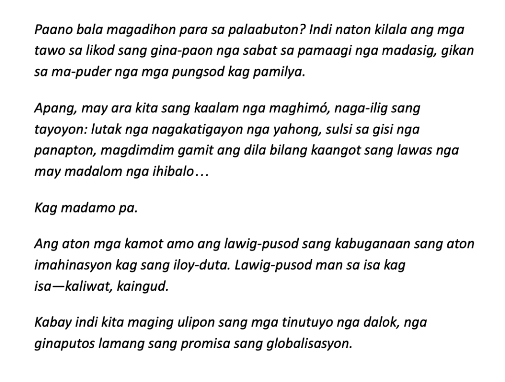 And so we return to the fundamental question, “paano bala magadihon para sa palaabuton?” with an answer: Sa pagpadayon sang paghimó, sa pagpakigbahin, kag sa pag-atipan sang palaabuton paagi sang nagahugpong nga kamot, lawas, kag hunahuna sang tanan.