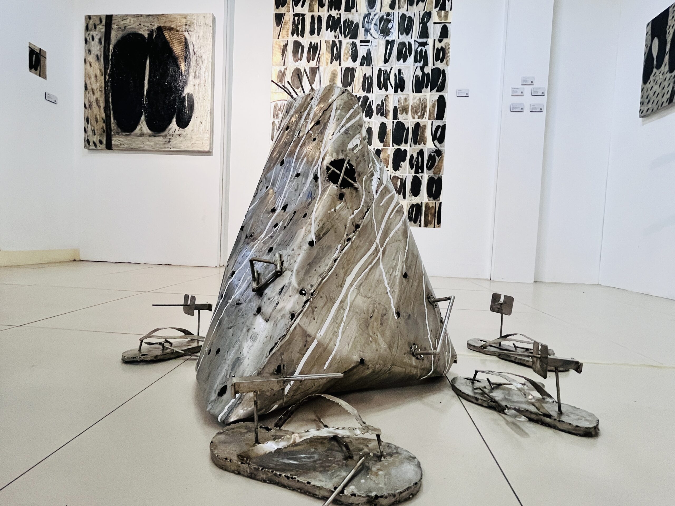 The most recent clash between navy forces of the Philippines and China is the focus of three distinct sets of sculptures: “Slipper Game,” the monumental triptych “Burador ni Juan,” which dramatically hangs from the gallery ceiling like a drone, and the “The Isle” series, which is presented on the gallery floor beneath a descending flying ladder.